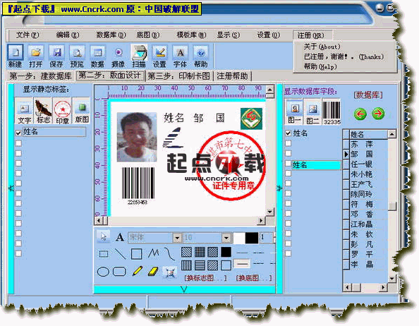 用于大单位批量设计、打印含相片或不含相片的名片和各种证件。1.用数据库整理大量的相片和数据,具有按相片生成时间和按图片名批量读入图片的功能,设计一次就可打印一批。2.支持单张补打;3.支持摄像头和扫描仪摄像;4.支持条形码打印;5.具有批量生成图片功能,把每张效果图独立生成任意格式的图片,方便通过其他设备进行打印或冲印;6.批量导入多行表格数据功能,适用于批量打印个人档案;8.提供多个模板,稍作修改,就制出自己的卡图,简单易用;8、支付镜面(反面)打印,套色打印。9、支持电子印章。