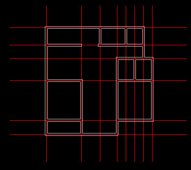 窗定位:算出窗中心点位置,用和画出辅助的轴线;再使用,选择窗宽度,在正确位置插入窗。(C1窗宽1800,C2窗宽900)关闭轴线的图层检查一下: