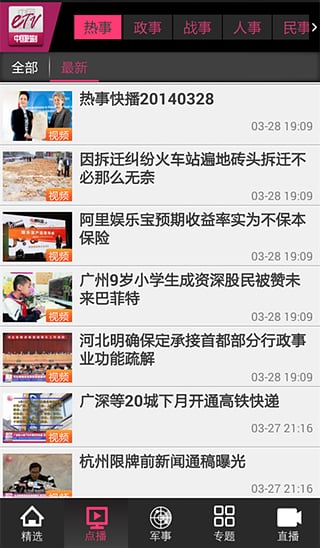 中国时刻eTV手机客户端按照主要划分首页、热点、点播、剧场、军事五大板块,以“深度、炫酷”为关键词,将高效、快速、深入的新闻资讯与潮流、多样的强档娱乐节目进行有机的多元组合,内容涵盖新闻资讯、娱乐强档、军事、财经、社会、生活、国际短片赏鉴(独家)、热播影视剧等多个类别。【功能特色】