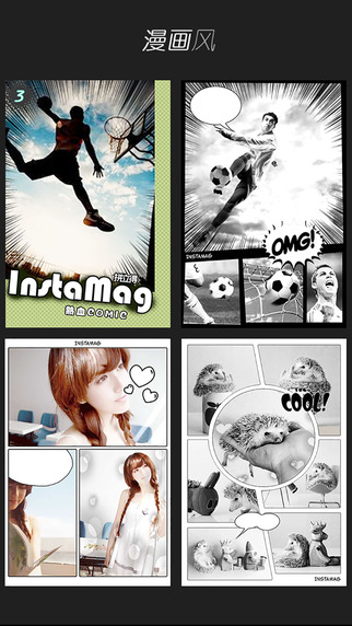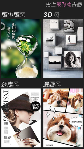 【杂志封面】数百套杂志风拼图模板,再普通的照片放上去都能让你成为万众瞩目的封面人物。【经典漫画】多达50套的漫画风拼图模板,外加数百个漫画贴纸、纹理,照片一下子就变得萌萌哒。