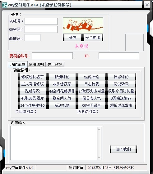 修改超长名字、相册评论、说说评论、日志评论、主人寄语修改、QQ头像获取、日志转载、说说转发、说明修改、QQ空间花藤操作、获取历史访问量、获取今日访问量、获取QQ秀图片、刷空间人气、刷日志人气、Q秀赠送鲜花、24小时免费挂Q、赠送礼物、QQ空间留言、超长说说发表