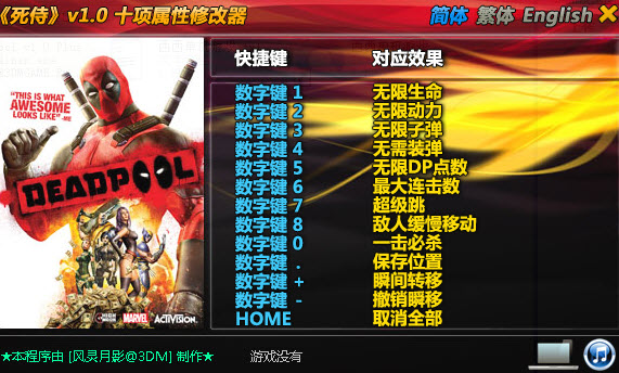 数字小键盘1; 无限生命; (对于BOOS一击被必杀无效)数字小键盘2; 无限弹药、手雷