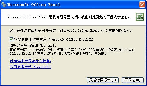 打开任意Excel文档,均出现“Microsoft Office Excel 遇到问题需要关闭。我们对此引起的不便表示抱歉。您正在处理的信息有可能丢失。Microsoft Office Excel 可以尝试为您恢复”。