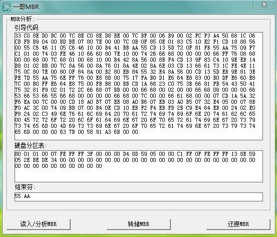 一哥MBR是一个硬盘主引导记录分析器,支持读入、转储、还原MBR。