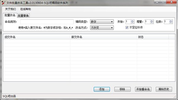 命名规则:定义重命名过程中的命名规则,可使用"*"与"#"号。"*"号代表原文件名。"#"号代表以数字或字母插入置顶位置。例:原文件名为sql8.rar 命名规则输入sql8_*则命名结果为:sql8_sql8.rar;命名规则输入sql8_#(#定义开始为1)则命名结果为:sql8_01.rar。