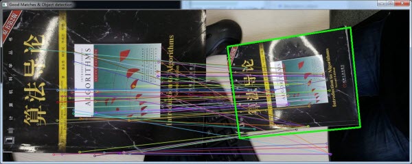 利用FLANN特征匹配算法进行匹配,此算法封装在FlannBaseMatcher类中,匹配后保留好的特征匹配点。利用findHomography获取匹配特征点之间的变换,最后利用perspectiveTransform定位到场景图中物体的4个点。