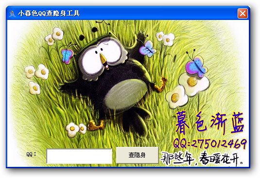 小暮色qq隐身查看器由暮色渐蓝开发, 使用方法:开启工具后,输入要查询的qq,点击“查隐身”按钮即可。