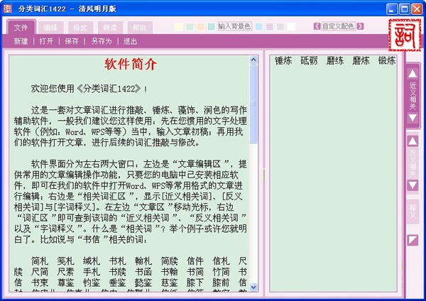 分类词汇这是一套对文章词汇进行推敲、锤炼、藻饰、润色的写作辅助软件,一般我们建议您这样使用:先在您惯用的文字处理软件(例如:Word、WPS等等)当中,输入文章初稿;再用我们的软件打开文章,进行后续的词汇推敲与修改。