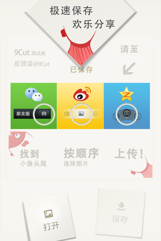 9Cut是一款把照片裁切成9块来上传后拼贴为1张大图的应用。用它你就可以告别只发布1张小缩略图而得到9张拼成的夺人眼球的震撼大图啦,实乃刷屏利器!