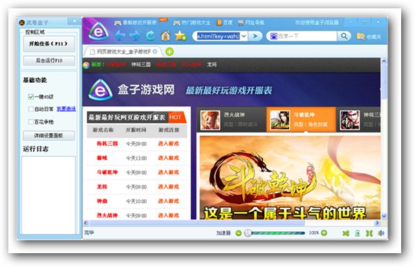 武尊盒子是盒子游戏网专为《武尊》网页游戏制作的辅助工具,安装盒子浏览器即可启动武尊盒子,提供一键45级、自动日常、自动赏金猎人、妖除魔、百花争艳、领取3倍奖励、小号多开、后台挂机、自动主线等辅助功能,让你上班、开会都能够轻轻松松挂小号。