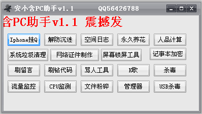 iPhone挂Q、解防沉迷、空间日志、永久养花、人品计算、系统垃圾清理、网络证件制作、屏幕锁屏工具、记事本加密、刷留言、刷钻代码、骂人工具、K歌、杀毒、流量监控、CPU监测、文件粉碎、管理器、USB杀毒。