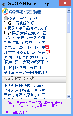 散人秒点腾讯图书VIP 免费版 散人秒点腾讯图书vip点亮是一款可以点亮图书vip图标的辅助工具,通过手机QQ书城登录操作,完全免费哦,理论图书vip会永久,建议在个人账户打上自动续费即可,当然也看人品的,本工具可重复使用,赶紧去点亮吧。
