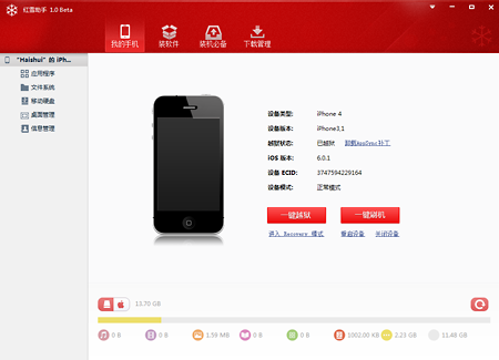 红雪越狱工具是千团互动(北京)信息技术有限公司 旗下品牌产品,是国内首款支持苹果IOS应用一键下载、安装的PC端辅助工具,并且同时支持iPhone、iPad、iTouch等iOS设备的软件、游戏、壁纸、铃声资源的下载安装和管理工具。与同类软件相比,它具有界面清爽、操作流畅、下载飞速、资源海量、免越狱等优势。让苹果手机用户在无需越狱的情况下就可以免费安装正版的应用软件。