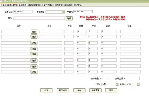 易达出入库库存单据打印软件:软件主要面向企业单位打印出库单和入库单,库存统计管理等功能,支持盘点管理,打印入库单,打印出库单销售统计查询分析,数据导出,商品管理,客户管理等功能。