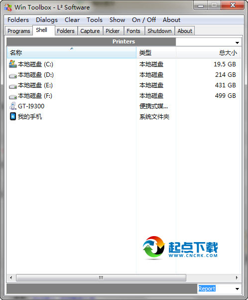 4、Drives标签页中可以查看到硬盘分区,双击就能调用资源管理器打开,除此之外,在这个标签页右上角的下拉菜单中,你还可以查看打印机、最近打开的文件夹、桌面、“发送到”文件夹。