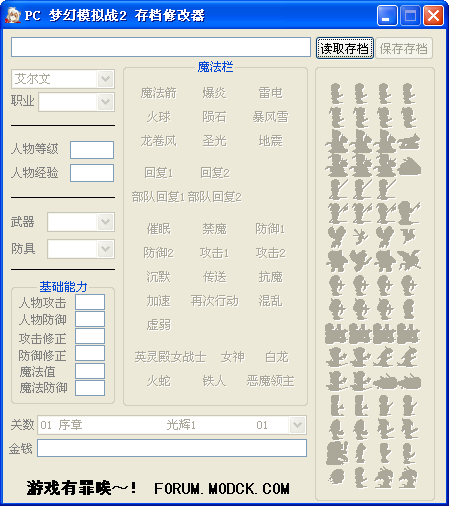 梦幻模拟战2存档修改器是修改电脑版梦幻模拟战2的存档修改器,目前只能修改非战斗存档。