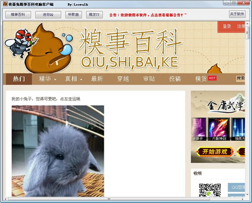 夜幕兔糗事百科电脑客户端 3.0 免费绿色版 夜幕兔糗事百科电脑客户端是一款提供网络上最新最全的糗人糗事,糗事百科客户端里包含大量糗事内容!有图片,有文字。并且提供糗友交流平台。并且提供糗友交流平台。附带迷你QQ,全面支持软件最小化托盘欢迎您下载使用。