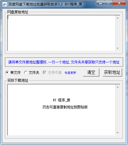百度网盘下载地址批量获取工具下载v3.2 免费版 百度网盘下载云概念渐渐的融入到平常的上网生活中,很多的人都开始使用云网盘同步资源了,有时候发现了个好的网盘,里面有很多有用的资源,很想快点下载,但一个一个点击下载又太过麻烦,所以制作了百度网盘下载地址批量获取工具,希望对大家有帮助。