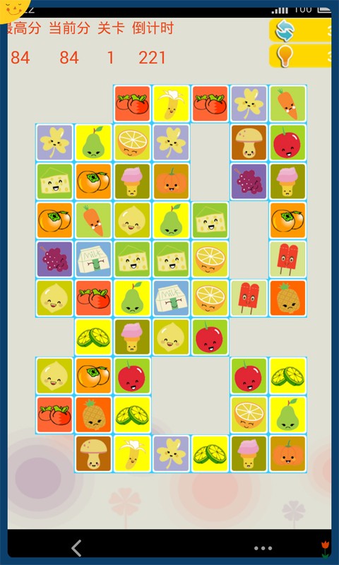 连连看之水果连连看 3.2.6 安卓版 连连看之水果连连看:是安卓上最好玩最有趣的水果连连看小游戏,让你玩到手抖!操作方法跟其它的连连看游戏一样。连续点击2个相同的图标,如果它们之前能够用线条连接,而且线条不超过3根,就可以消掉。在游戏的下方有旋转按钮和放大镜,可以给您提供游戏帮助。单击菜单,您可以设置声音和游戏时间。
