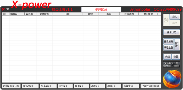 X-power挂Q工具是一款非常好用的批量挂q软件,快如闪电是软件的主推特性,多线程挂q不在话下,同时软件自带超高速导入账号功能,在导入过程中,会自动去除同账号同密码,且保留同账号不同密码,极大的提高了挂q效率,另外在使用本软件时请保证网速,建议关闭其他占用CPU及网速的程序。请不要在同一时刻频繁开启软件,以免出错。