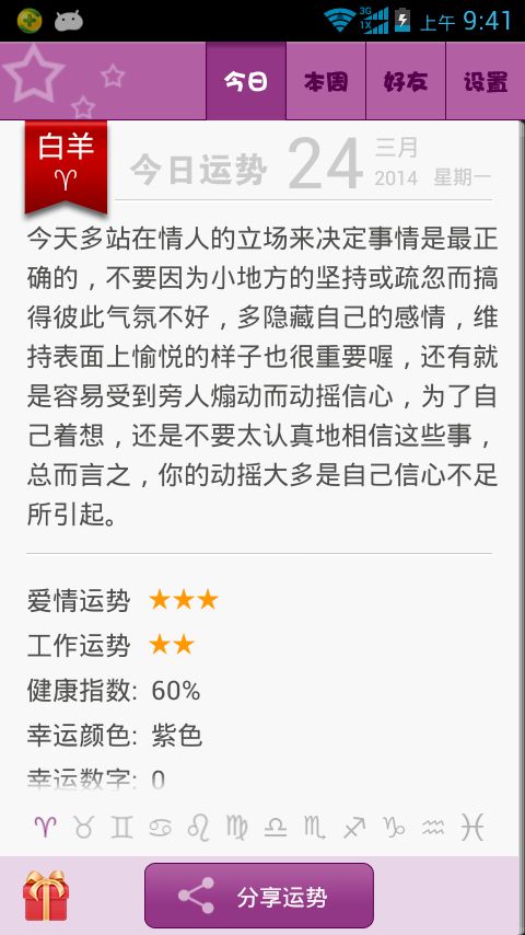 原星座运势现更名为星座好友。包含今天运势、每周运势、好友性格分析、星座配对、星座好友管理功能,可以将联系人批量导入为星座好友。星座好友App拥有非常华丽的界面,新颖且方便的操作体验,非常灵验的十二星座运势,每日运势、每周运势简洁而详尽,黑霉日,红心日天天监测,及时将运势分享到给微博好友。喜欢这款应用的星座朋友们可以在Google Play评论上留下建议和意见,让我们一起将她打造得更好。【更新日志】
