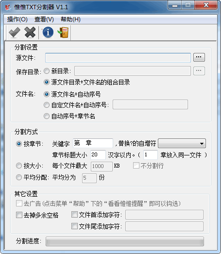 惟惟txt分割器是一款免费的文本文件分割器,本工具可以切割无限制大的txt小说,分割之后存放手机可以快速打开并且阅读。提供去空格、增加文字说明等功能,软件小巧,欢迎网友们使用。