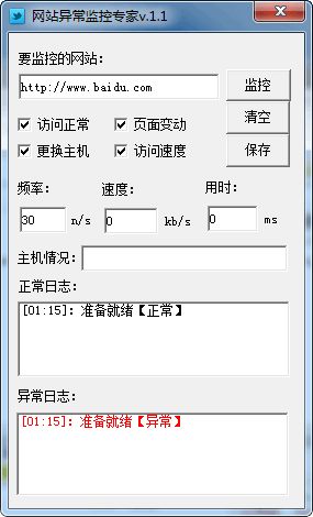 网站异常监控专家 v1.1 中文绿色版 网站异常监控专家可监控站点是否正常访问,出现错误时会加入提醒,可检查下载速度,实时知道宽带 是否不足,可计算访问用时,知道从打开一个网页到读取完毕这段时间,可检测域名解析是否变动,可监控主页是否遭到修改,支持设置监控间隔,按照主机压力而 来,有了它,可轻松掌握主机情况。