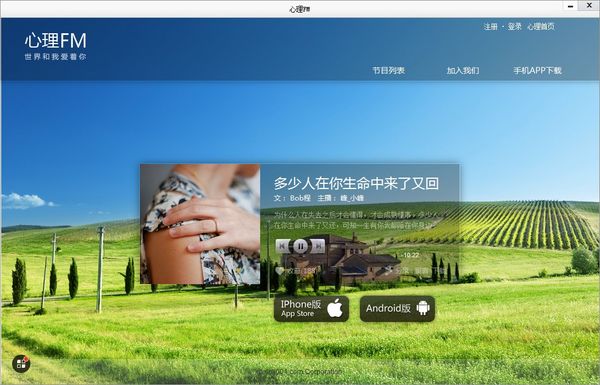 心理FM网络电台是一个治愈系的心理电台,心理网下一个特色频道,把一些温暖的文字,找一些温暖的人,配上好听的音乐录制下来,和网友分享。它是一个纯公益的平台,来自全国热心的主播,在心理网工作人员的协作下,录制让人感动、成长、内心变得强大的文章。一切正如心理FM的口号一样“世界和我爱着你”,一群热心的人在这个平台上,传递温暖和爱!另外,心理FM上还有一些少量的治愈系音乐,心理科普知识等。