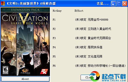 文明5:美丽新世界是大型策略游戏文明5的第二个独立资料片,增加了两个元素,四大新的游戏系统和几十个新单位,玩家将通过文化和旅游的渗透去征服世界,很有挑战性,期待你的加入。本次给大家带来一款辅助修改工具,共添加了6个修改选项,帮助玩家降低游戏难度,轻轻松松建造一个属于自己的庞大帝国。