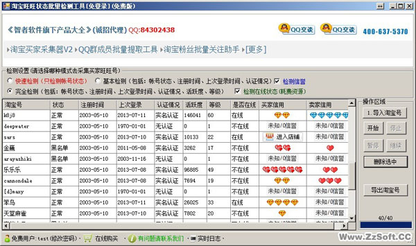 淘宝旺旺状态批量检测工具是智者软件出品的一款批量检测淘宝旺旺号是否异常、被封、注册时间、最后登录时间、认证情况、活跃度、等级、信用的软件,无需密码,免登录批量查询淘宝旺旺状态!可以自由排序、删除选中、一键删除异常状态的帐号、导出等!