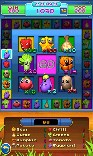 蔬菜大亨安卓版是一款休闲类的类似虚拟老虎机的小游戏,玩家可以不花钱享受到和老虎机一样的乐趣,蔬菜大亨安卓版里面拥有8种搞怪逗趣的角色,拥有从2到100跨度惊人的赔率,搭配不同的下注组合,再加上一点点冒险精神,就可以让金币掉落的声音响彻你的耳朵。你能不能成为百万富翁那就看你的运气了。