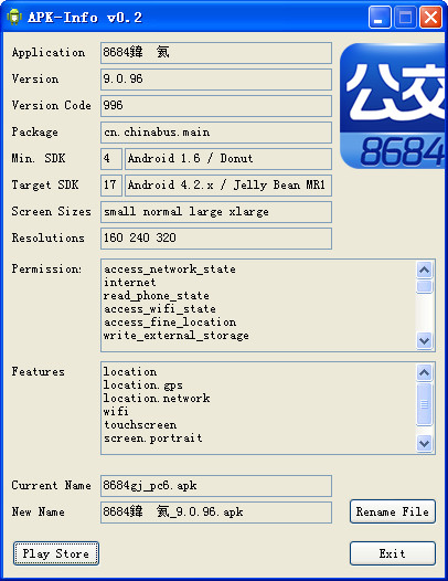 这个免费的小工具还不到1MB,简单却颇为实用,可以显示APK对应的应用名、图标、版本、封装、SDK/API级别(最低支持系统版本)、屏幕尺寸、分辨率,特别是会完整列出所需权限,还能直接跳转到Google Play商店页面。