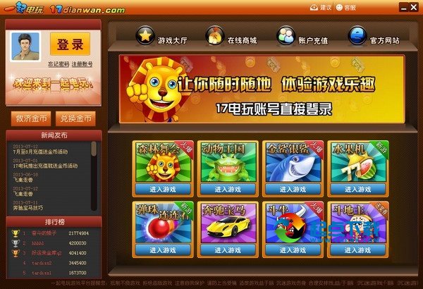 一起电玩集于一体的网络游戏!让您在休闲娱乐的同时展示自己无限魅力于网络,超越了传统街机的枯燥乏味。在这里,您可以在家里就能玩游戏厅的游戏,捕鱼达人,森林舞会,3D动物王国,森林舞会网络版,飞禽走兽游戏,万能鲨鱼大白鲨,金鲨银鲨,奔驰宝马,老虎水果机、牛牛、斗地主多款街机游戏总有一款适合您。还等什么快来17电玩游戏吧。(可以兑换实物奖品)