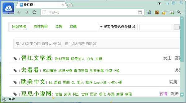 魔爪下载支持很多网站下载如新浪连载、原创频道,晋江小说网,四月天小说网,鲜鲜小说网,qq连载、原创频道等等,是一款功能强大的小说搜索软件。