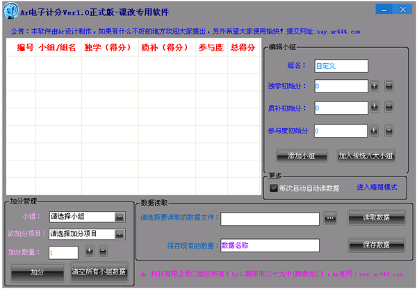Ar电子计分下载 v1.0 官方正式版 Ar电子计分是一款课改专用计分软件,支持传统八大小组(A-H),轻松解决手动计分问题,高效快速,当然也可以自己手动编辑小组,欢迎下载体验。这款软件是由我们起点网站精心挑选的,希望广大朋友能喜欢!