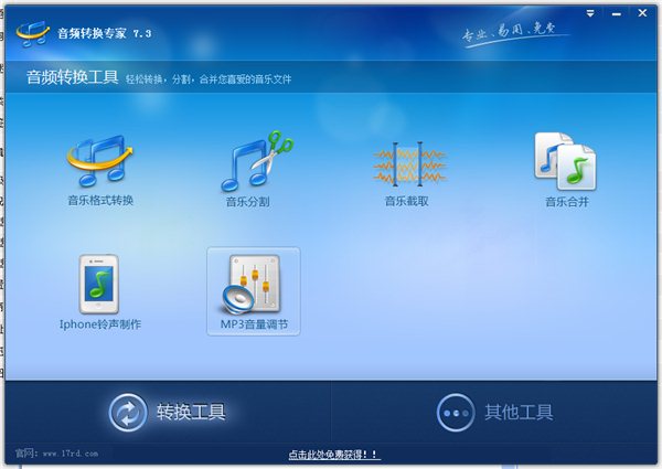 6.MP3音量调整:在没有任何音质损失的前提下,调节MP3歌曲的音量。能够在刻录音乐光盘前或者拷贝歌曲到手机前,将所有MP3歌曲的音量分析并调整到相同大小,欣赏歌曲的时候就再也不必经常调节播放器的音量了。