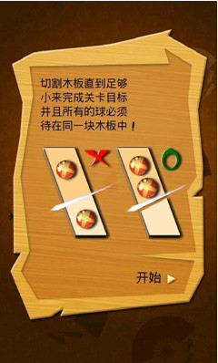 有100个关卡设置,每个关卡都有一个不规则形状的木板,竖起你的食指轻轻一划,木板就会脱落,把木板削到一定大小就可以过关。不过要小心,每个木板里面都有几个一直在移动的球球,一定不要切到哦!