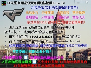 cf无道官服超级变态辅助按键版beta 19 最新稳定版 cf无道官服超级变态辅助按键版是专为cf正式服制作的辅助工具,无道cf辅助支持穿越火线最新客户端,游戏中按F12键可呼出/隐藏功能菜单,稳定不掉线,欢迎下载体验。