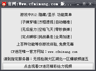 cf迷茫官服无视检测变态辅助sp9 最新免费版 cf迷茫官服无视检测变态辅助是专为cf官服制作的全能辅助工具,cf无视检测辅助能够帮助你找到无检测大区,进入游戏中,按F12键显示/隐藏功能菜单,支持最新cf游戏客户端,欢迎下载体验。
