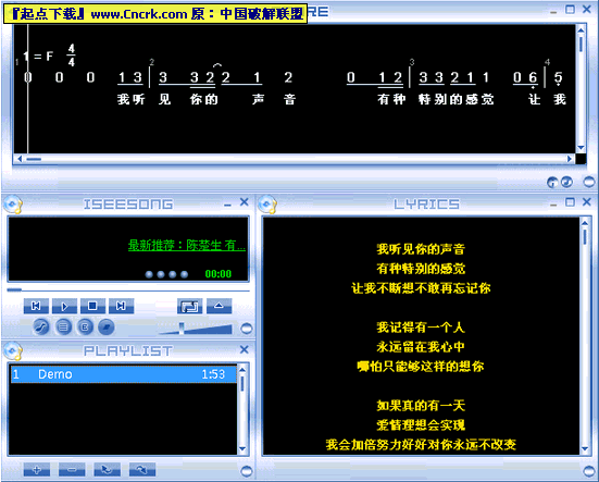 iSeeSong是一款全新概念的音乐播放平台,不仅具有普通播放软件的功能以外,由于采用了iSeeSong Team独创的Mp3X技术,更是具有同步显示乐谱和歌词等特色功能。有了iSeeSong,音乐不只是可以听的,更是可以看的,容易学唱的,方便交流和展示的!iSeeSong将开启一个音乐欣赏的新纪元