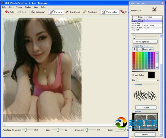 GMX-PhotoPainter实现照片油画效果的方式不同于那些传统的油画滤镜。它可以使用各种不同的绘画技术把你的照片转换为新颖的数码艺术作品。该软件并排显示照片和艺术画布同时一个同步画笔允许你使用选择的绘制工具和你自己的笔刷在画布上进行绘画。