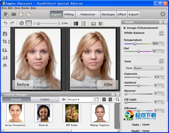 Reallusion FaceFilter 3四大功能:皮肤美化:可以重新修正人像照片调整肤色容光焕发,处理相片闪光形成的满面油光,调理肌肤纹路与细节塑造柔肤美肌,消除眼袋与黑眼圈和脖子与肩膀遮瑕,实际就是平时我们常说的磨皮效果。