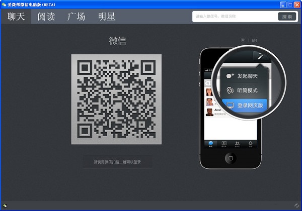 爱微帮微信电脑版是一款让你在电脑上使用微信的工具,基于网页版微信开发,能够作为一款单独的软件运行并显示消息提醒。需要扫描二维码登录,登录后的样式和网页版的一样,与网页版微信不同的是增加了广场和明星两个板块,方便用户查找公共帐号。