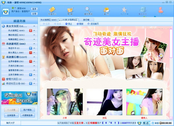 奇迹视频社区是由奇迹视频网官方推出的多人视频互动聊天工具,奇迹聊天室提供免费同城交友、婚恋交友、秀场视频ktv、音乐歌舞。