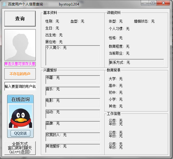 百度用户个人信息查询工具主要方便查询百度用户的基本资料,只要输入百度账号昵称即可查询到基本资料,还可以发起qq聊天哦!