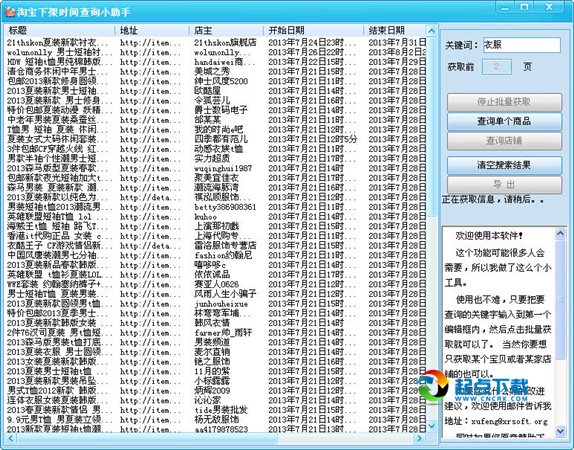 淘宝下架时间查询小助手 v1.0 绿色版 淘宝下架时间查询小助手这个功能可能很多人会需要,所以我做了这么个小工具。使用也不难,只要把要查询的关键字输入到第一个编辑框内,然后点击批量获取就可以了。 当然你要想只获取某个宝贝或者某家店铺的也可以。