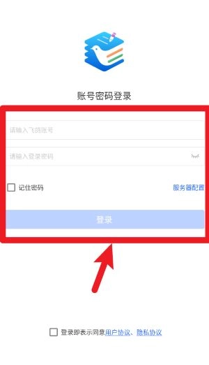 1. 打开应用,进入登录界面,在输入飞鸽账号和密码后,勾选协议,接着点击登录,便可开始使用。