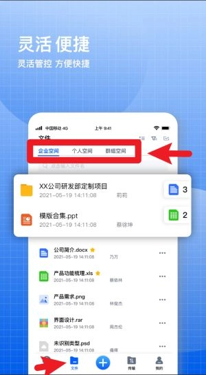 4、在文件总览页面,能够实现企业、个人及群组空间的切换,方便对多种类型文件进行灵活管理,操作简便快捷。