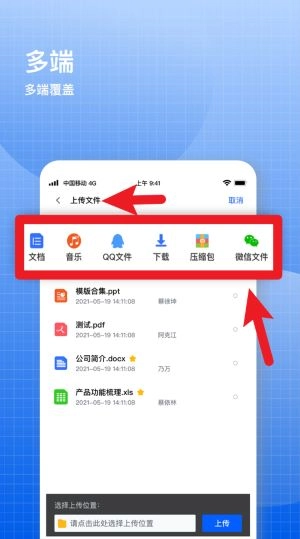 2. 在文件上传页面,点击分类图标,便能从文档、音乐、QQ文件等不同来源中选择进行文件上传。