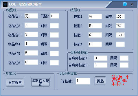 lol一键连招辅助 v0.3 绿色版 平时玩LOL看见别人丢技能速度很快,为了更快的打出伤害,一键连招必不可少!